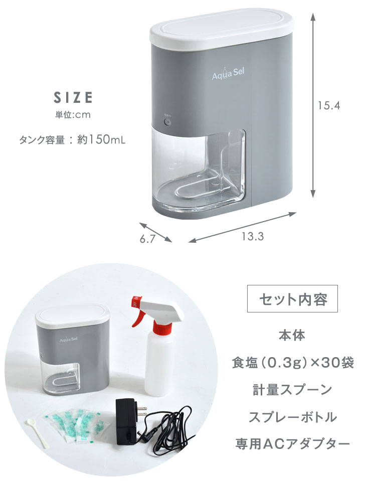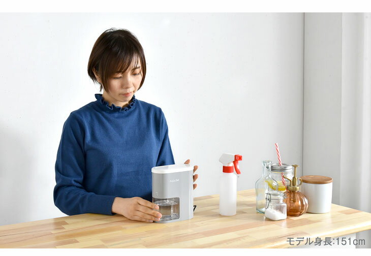 仕様表サイズ 幅13.3×奥行6.7×高さ15.4cm タンク容量:150mL コードの長さ:約1.5m 【スタッフほっしゃんのおすすめポイント!】 ・ご家庭で簡単!除菌水生成器 ・約2分で生成可能 ・ペットや人にも安全な電解次亜水 ・インフルエンザやノロウィルス対策に ・ペット用品の消臭・除菌や調理器具の除菌等、様々なシーンで活躍 ・生成した水は1週間効果持続! 重量 約275g 電源入力:AC100V 50/60Hz 出力:DC24V 1A 生成方法電気分解方式生成後成分次亜塩素酸含有食塩水(有効塩素濃度:50〜80ppm)生成時間 約2分 付属品 NaCl食塩(0.3g)×30袋、計量スプーン、専用ACアダプター、取扱説明書、スプレーボトル(容量200mL)×1本 生産国 日本 梱包サイズ 14×15×24cm 備考 【販売開始:2018年12月26日】 ※配送は全て宅配便(1人)での玄関渡しとなります。