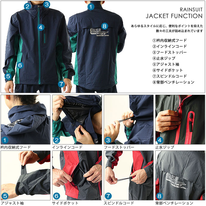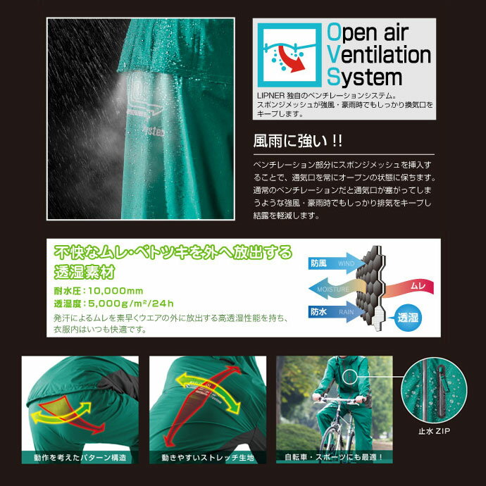 ロゴスのレインスーツ上下セット! ●動作を考えた動きやすい特殊パターン構造を採用。