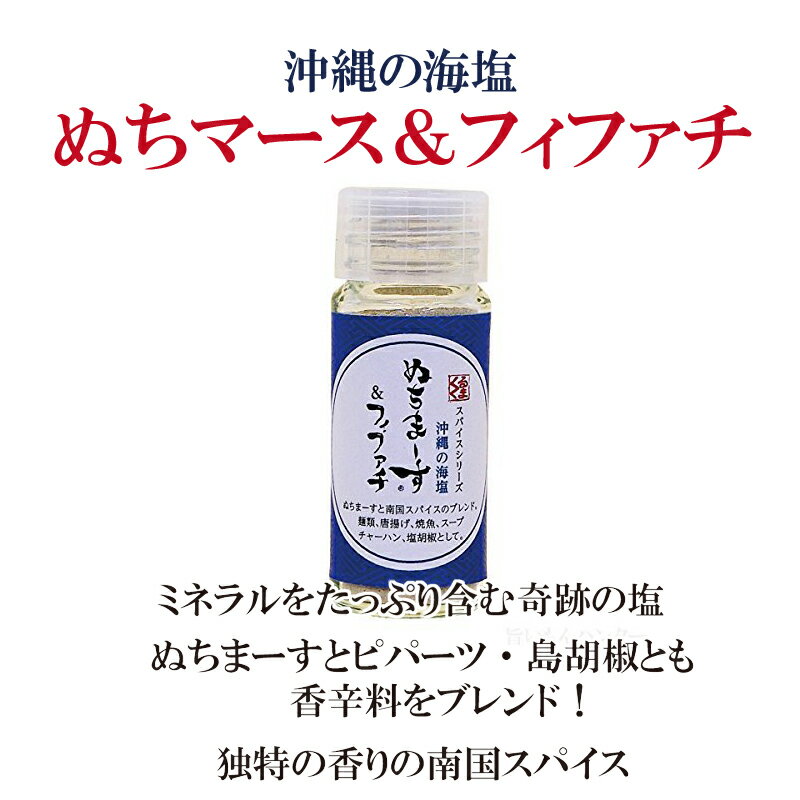 ミネラル成分を豊富に含む塩(マース)として人気の「ぬちまーす」と独特な風味が特徴の南国スパイス「フィファチ粉」をブレンドしたスパイシーな調味料です。